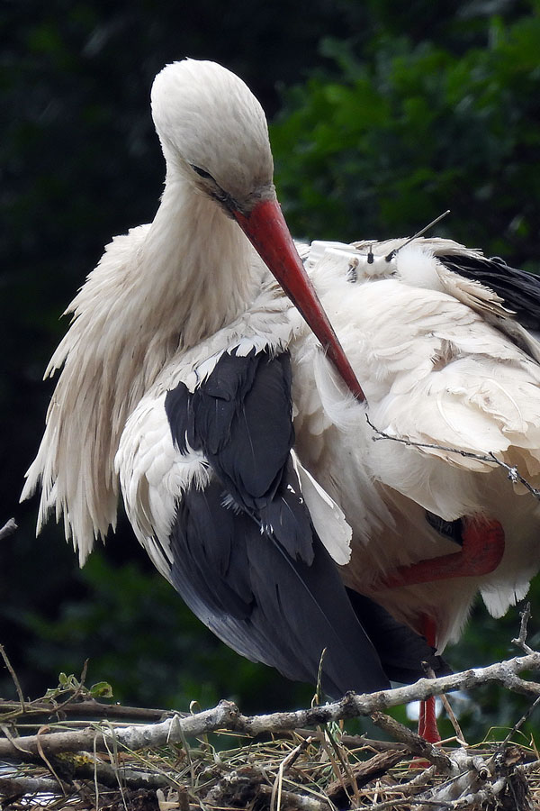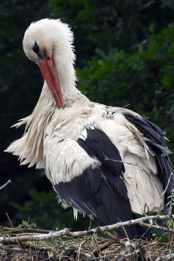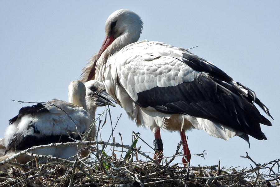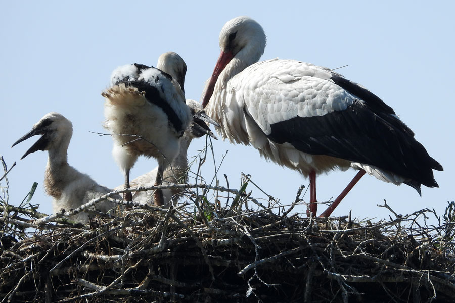 A mon arrivée sur place, accompagné de mon épouse et de l’ornithologue local Gert Dams, qui suit avec passion la septantaine de couples qui occupent la région, «Porrentruy» est au nid. Elle surveille sa progéniture avec beaucoup d’attention. Faut dire qu’elle a beaucoup à faire avec 3 cigogneaux âgées de 7 semaines, qui bougent constamment sur le nid.