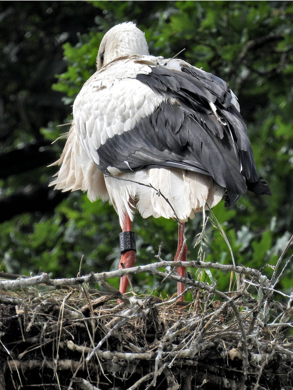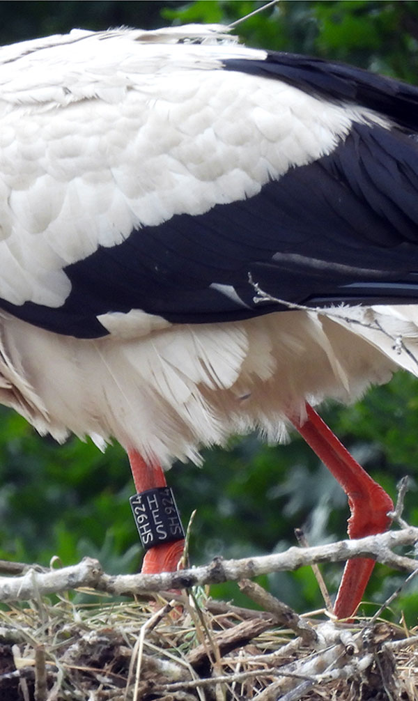 Dès que je l’ai vue, je l’ai de suite reconnue ! L’antenne de sa balise dépasse d’au moins 5 cm les plumes de son dos et elle porte, à la patte gauche, une bague noire avec le code HES SH 924.