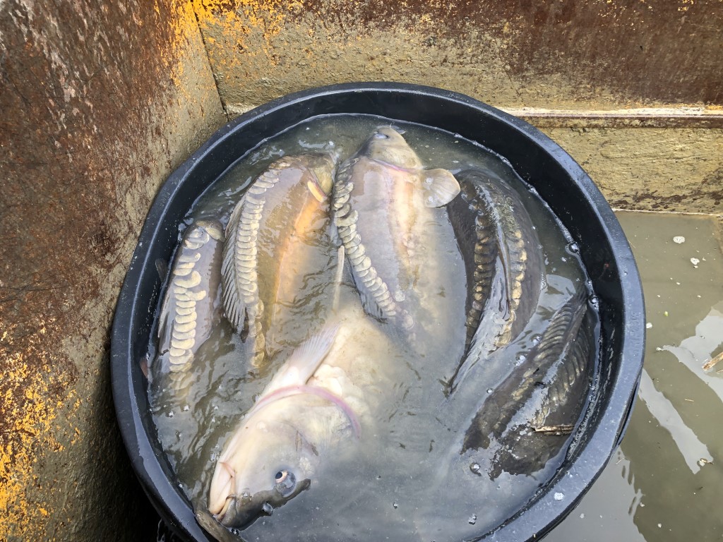 Ces plans d’eau n’avaient plus été vidés et pêchés depuis 2007 (pour le 2) et 2008 (pour le 1). Après les travaux de curage et de réfection des digues, lors de la remise en eau des étangs, la FMD n’a pas remis de poissons. La priorité est donnée aux espèces menacées, comme les Amphibiens, qui ne cohabitent pas bien avec les poissons, surtout dans les petits étangs. Toutefois, après la vidange, quelques carpes, rotengles et certains autres poissons résistants survivent plusieurs mois dans la vase, en attente de la remise en eau. De plus, ils restait quelques poissons dans le étangs amont 3, 4, 5 et 6 qui ont recolonisé les deux grands plans d’eau situés en aval. Dans les grands étangs 1 et 2, la reproduction des poissons a été bonne. Les Grands cormorans et autres oiseaux piscivores n’ont de loin pas tout mangé. En 2022, après plus de 10 ans en eau, il était important de vidanger et pêcher les deux grands plans d’eau. La vidange permet de mettre l’épaisse couche de vase du fond d’étang en contact avec l’oxygène de l’air. L’action naturelle de décomposition des matières organiques, par les microorganismes aérobies, est ainsi favorisée.